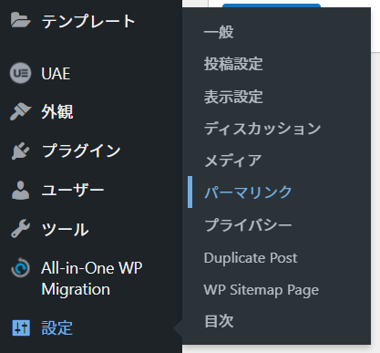 1.WordPressの管理画面から 「設定」 → 「パーマリンク」 を開きます